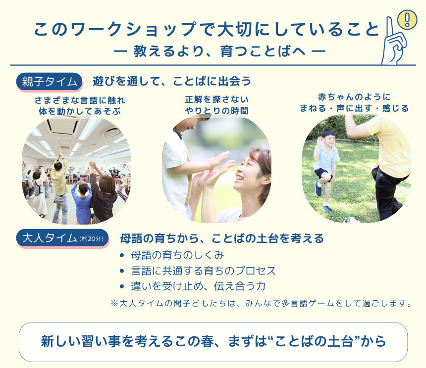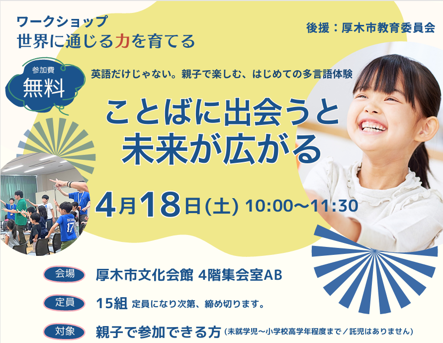 「ワークショップ 世界に通じる力を育てる」 親子で多言語を楽しんでいただくワークショップを4月18日厚木市で開催します。厚木市教育委員会のご後援をいただき、厚木市文化会館で開催します。 テーマは「ことばに出会うと未来が広がる」 英語だけじゃない。親子で楽しむ、初めての多言語体験!ぜひお気軽にご参加ください。 ◆2026年4月18日(土)10:00~11:30会場:厚木市文化会館 4階 集会室AB 定員:各回15組先着順です。参加費無料。託児はありません。